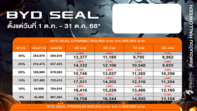 ราคาและตารางผ่อน BYD SEAL ตั้งแต่วันที่ 1 - 31 ตค. 68 บีวายดี จินหลง สาขาราชพฤกษ์