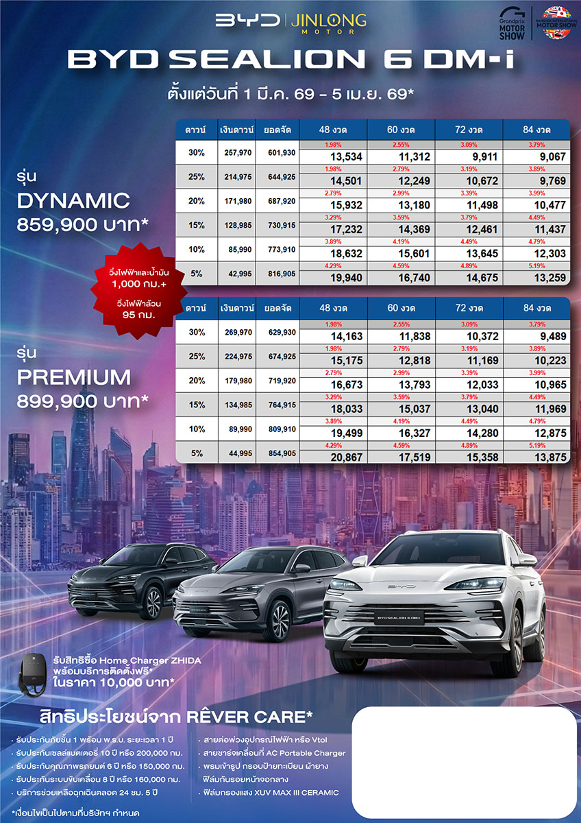 ราคาและตารางผ่อน BYD SEALION 6 DM-i ตั้งแต่วันที่ 1 มี.ค. 69 – 5 เม.ย. 69*