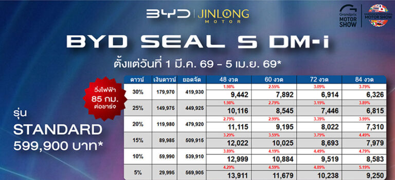 ราคาและตารางผ่อน BYD SEAL 5 DM-i ตั้งแต่วันที่ 1 มี.ค. 69 – 5 เม.ย. 69*