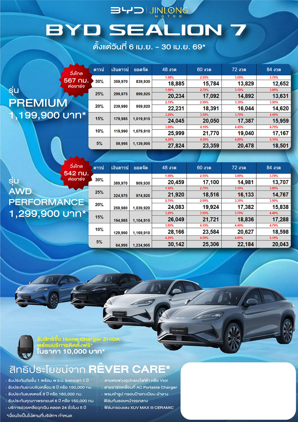 ราคาและตารางผ่อน BYD SEALION 7 ตั้งแต่ 6 เม.ย. 69 – 30 เม.ย. 69*