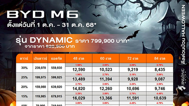 ราคาและตารางผ่อน BYD M6 ตั้งแต่วันที่ 1 - 31 ตค. 68 บีวายดี จินหลง สาขาราชพฤกษ์