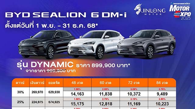 ราคาและตารางผ่อน BYD SEALION 6 DM-i ตั้งแต่วันที่ 1 พย. - 31 ธค. 68 บีวายดี จินหลง สาขาราชพฤกษ์
