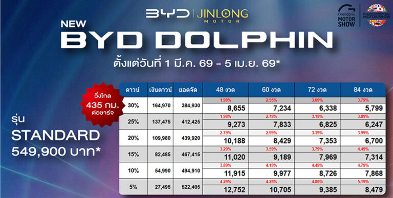 ราคาและตารางผ่อน BYD DOLPHIN ตั้งแต่วันที่ 1 มี.ค. 69 – 5 เม.ย.69*