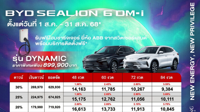 ราคาและตารางผ่อน BYD SEALION 6 DM-i ตั้งแต่วันที่ 1 สค. - 31 สค. 68 บีวายดี จินหลง สาขาราชพฤษ์