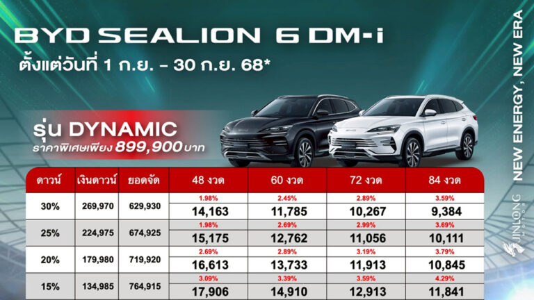 ราคาและตารางผ่อน BYD SEALION 6 DM-i ตั้งแต่วันที่ 1 - 30 กย. 68 บีวายดี จินหลง สาขาราชพฤกษ์