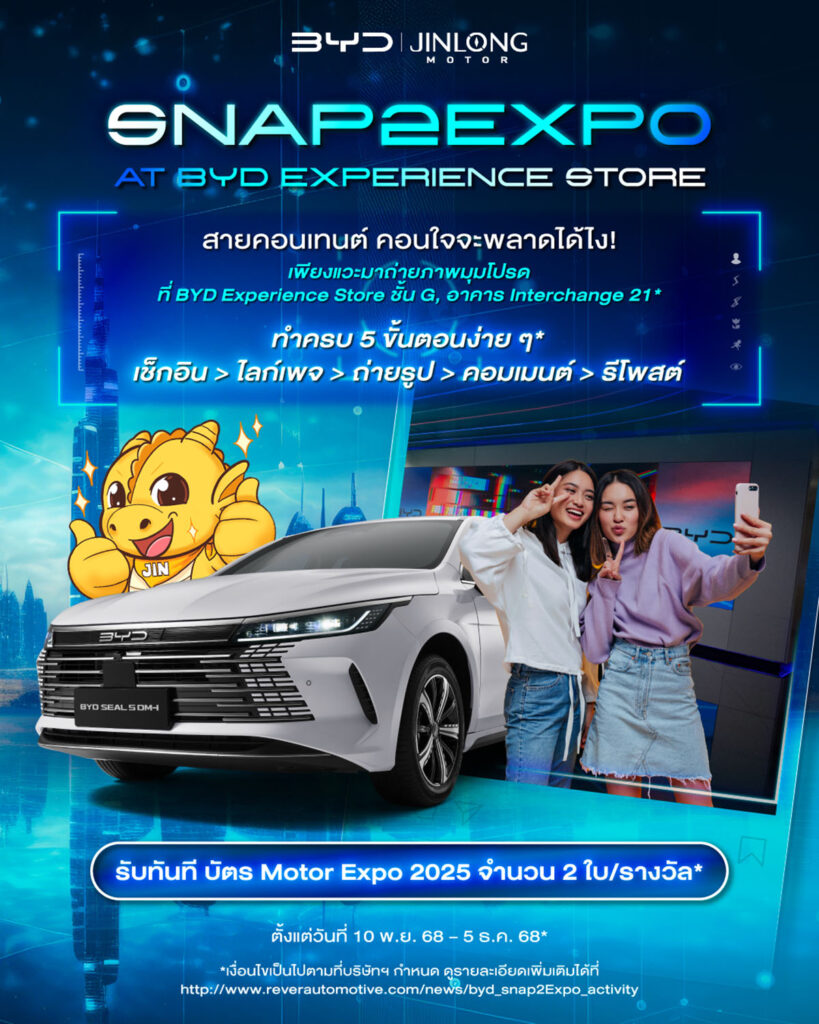 BYD จินหลงมอเตอร์ ขอชวนสายคอนเทนต์และคนที่อยากไปงาน มหรรมยานยนต์ครั้งที่ 42 (Motor Expo) มาร่วมสนุกกันได้ที่ BYD Experience Store ชั้น G ตึก Interchange 21 (อโศก) ให้คุณได้สัมผัสนวัตกรรมรถยนต์พลังงานใหม่จาก BYD