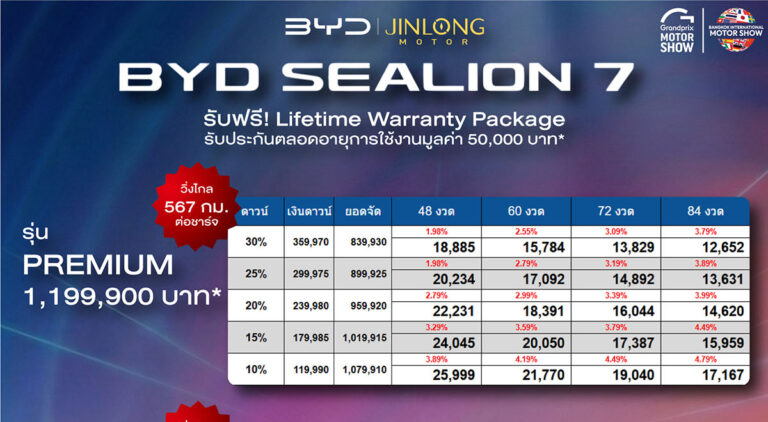 ราคาและตารางผ่อน BYD SEALION 7 ตั้งแต่ 1 มี.ค. 69 – 5 เม.ย. 69*